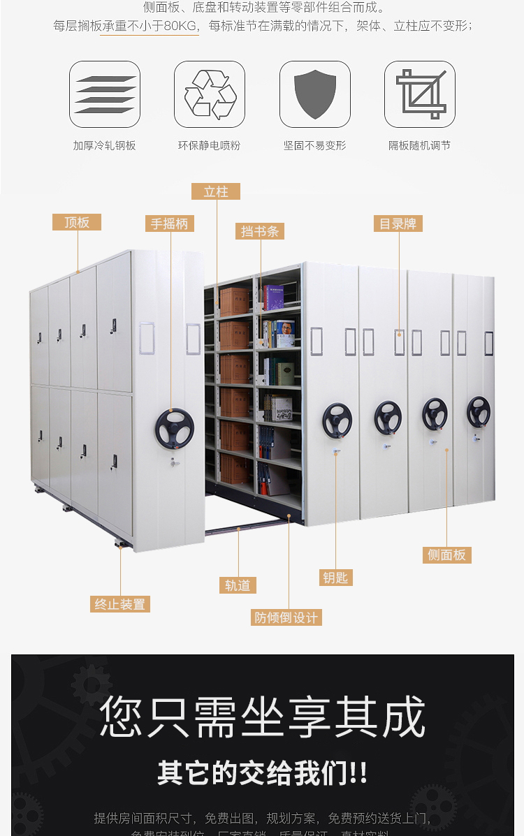 手動檔案密集柜/架、電動智能密集柜/架、移動檔案密集柜。以及密集柜/架的拆裝業(yè)務(wù),定做方案設(shè)計,免費上門測量,五年保修,終生維護。檔案室密集柜、資料室密集柜、移動檔案柜、移動密集柜、密集型檔案柜、密集型資料柜、密集型儲物柜、密集檔案柜、手動檔案柜、手動密集柜;醫(yī)院檔案病歷室用病歷密集柜/架;設(shè)計院用圖紙密集柜、底圖密集柜;檔案倉庫用倉儲室密集柜、檔案庫密集柜、資料庫密集柜;**圖書室用圖書室密集柜、磁帶密集柜;法院用傳票密集柜;財務(wù)用憑證密集柜;標本密集柜、樣品密集柜。密集柜/架也叫移動檔案柜、移動密集柜、密集型檔案柜、密集型資料柜、密集型儲物柜、密集檔案柜、手動檔案柜、手動密集柜;檔案密集架安裝要求,電動密集架 ,智能密集架 ,移動密集架, 手搖密集柜 ,軌道式檔案柜, 檔案架 ,圖書館書架 。按制作工藝分類:無門密集柜、半封閉式密集柜、全封閉式密集柜、兩柱式密集柜、三柱式密集柜、箱式密集柜。適合于檔案館、資料館、公司、銀行、以及企事業(yè)檔案室用。www.guandin.cn