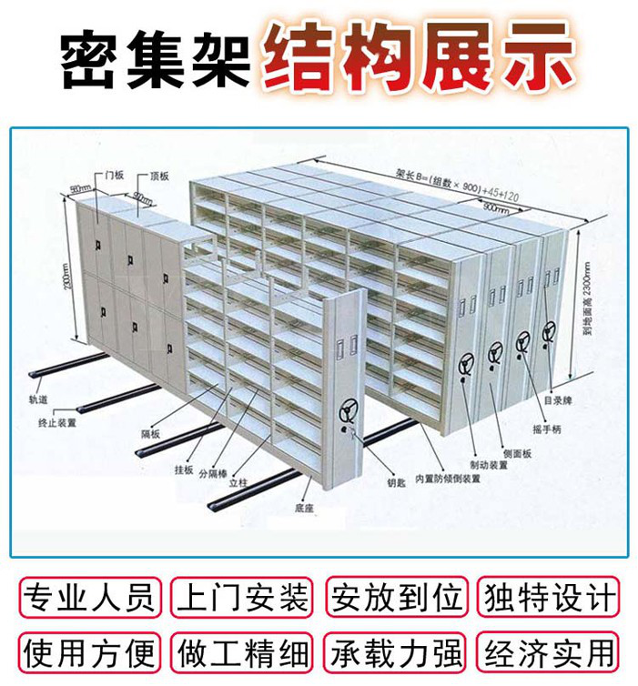 密集柜主要由軌道、底座、立柱(板式)、擱板、掛板、側(cè)靠板、背靠板、頂板、防塵板、護(hù)板、門(mén)板、傳動(dòng)機(jī)構(gòu)、防傾倒、防震、防塵、防鼠、制動(dòng)、緩沖、目錄卡及傳動(dòng)裝置、密封裝置組 成: